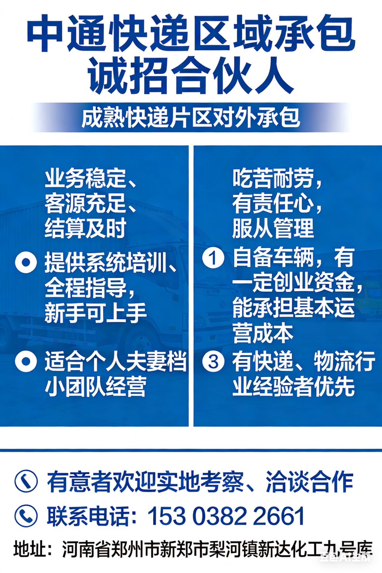要求:吃苦耐劳,有责任心,服从管理,自备车辆,有一定创业资金,能承担基本运营成本,有快递、物流行业经验者优先