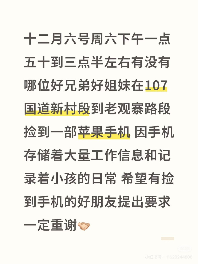 12月6号一点四十从新村大道回家路上途径107国道 不小心把手机丢了 因手机有大量工作内容和记录小孩以及家人的日常 恳请捡到手机的好心人能够归还 一定重谢 只要我能做的到的我一定满足
